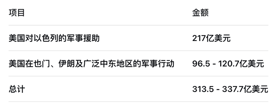 这意味着美国两年来在中东地区冲突中累计支出已达到313.5亿至337.7亿美元。