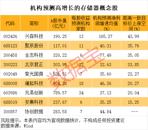 未来增长潜力来看,机构研报或能提供一定参考。据数据宝统计,根据5家以上机构一致预测,2025年、2026年净利润增速均有望超20%的存储器概念股仅9只,澜起科技、兆易创新(603986)、紫光国微(002049)、全志科技、北京君正等龙头股榜上有名。