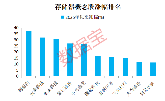 据证券时报·数据宝统计,截至6月13日收盘,A股市场存储器概念A股市值合计6413亿元,今年以来平均上涨1.9%。德明利(001309)、安集科技、全志科技(300458)、聚辰股份、中电鑫龙(002298)5股年内累计涨幅超20%。